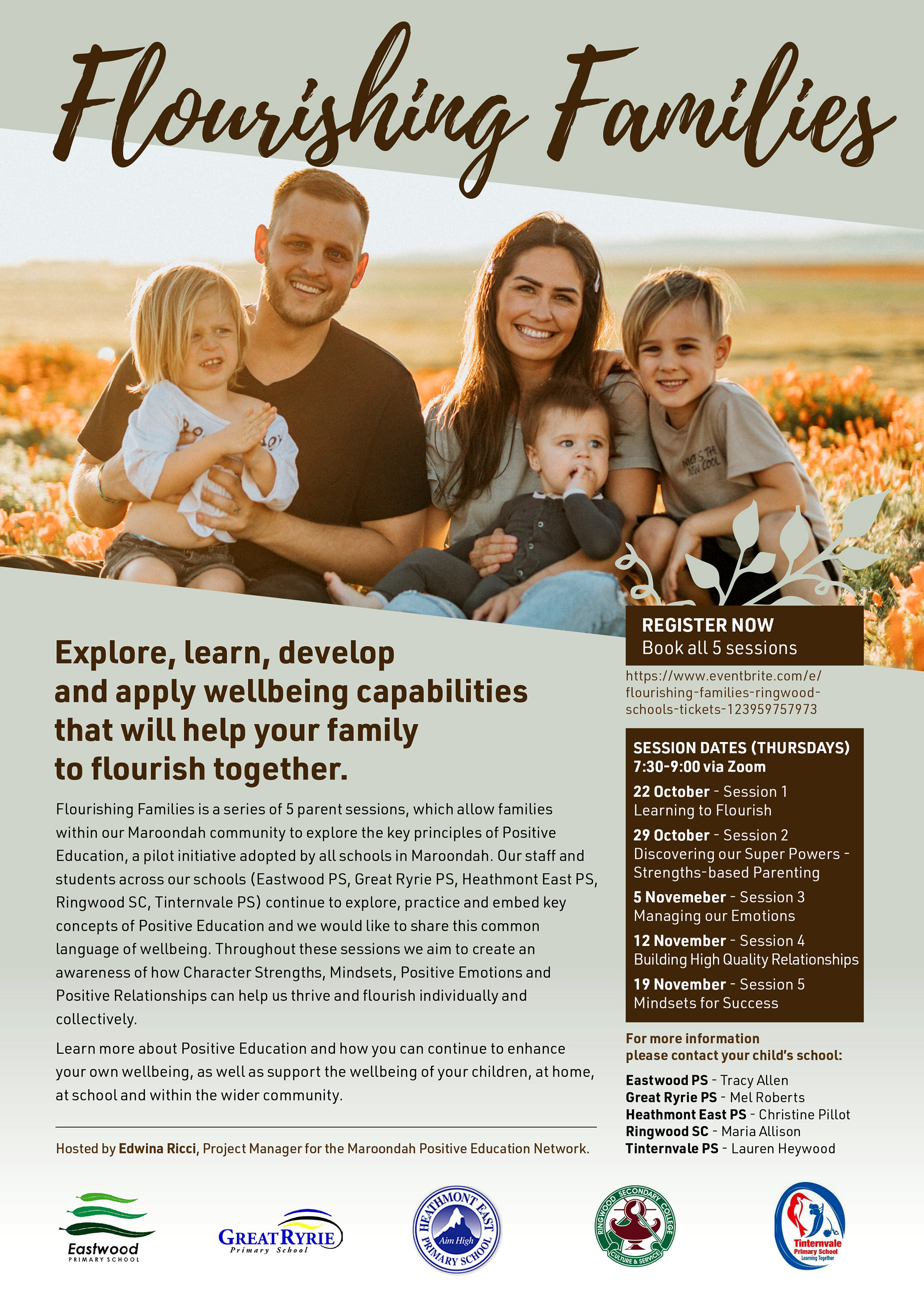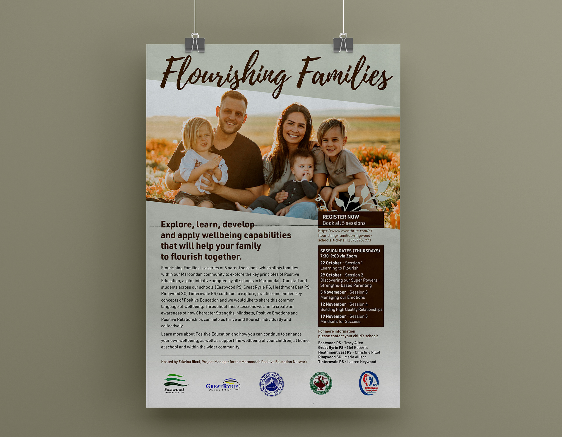 Poster for a webinar series that aims to equip families with language, skills and knowledge that, when applied intentionally, will help build wellbeing and resilience and a buffer against the negative effects of mental illness.